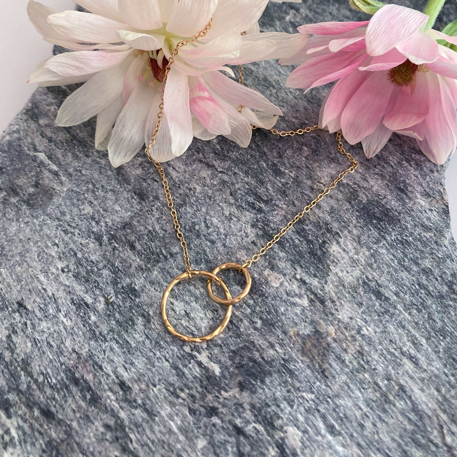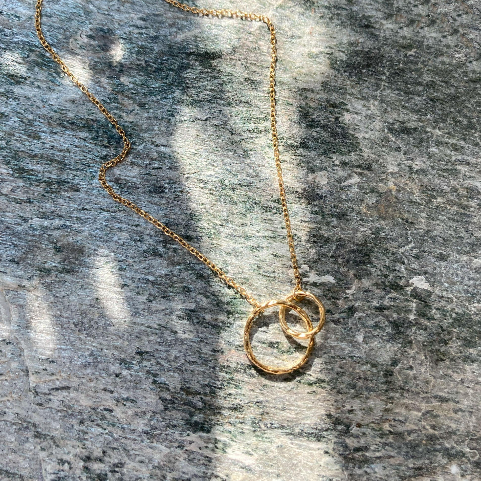 Diese zauberhafte Kette ist mehr als nur ein Schmuckstück – sie ist ein Symbol der bedingungslosen Liebe. Die beiden Kreise stehen für die unzertrennliche Verbindung, die ein Leben lang hält.